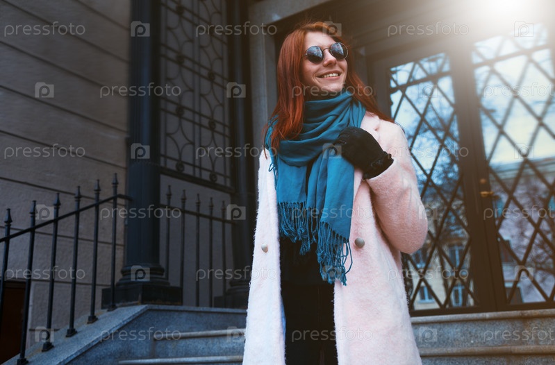 Рыжая красивая девушка идет по улице