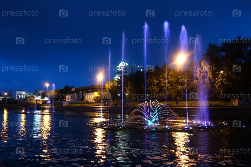 Светящиеся фонтаны в вечернем Екатеринбурге