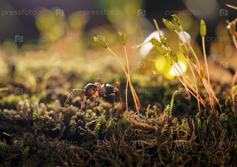 Оранжевый муравей на зеленом мхе