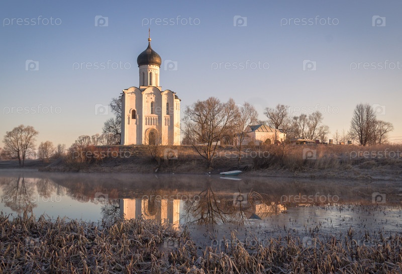 Старинная белая церковь на берегу озера