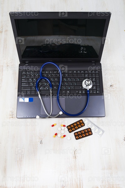 Концепция здравоохранения. Стетоскоп на ноутбуке