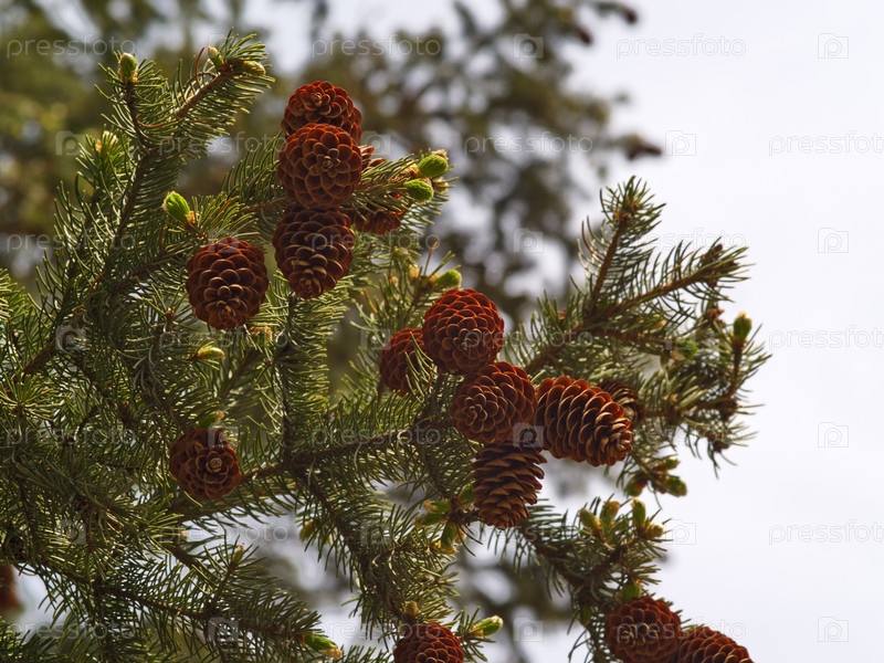 Елка с шишками на фоне неба
