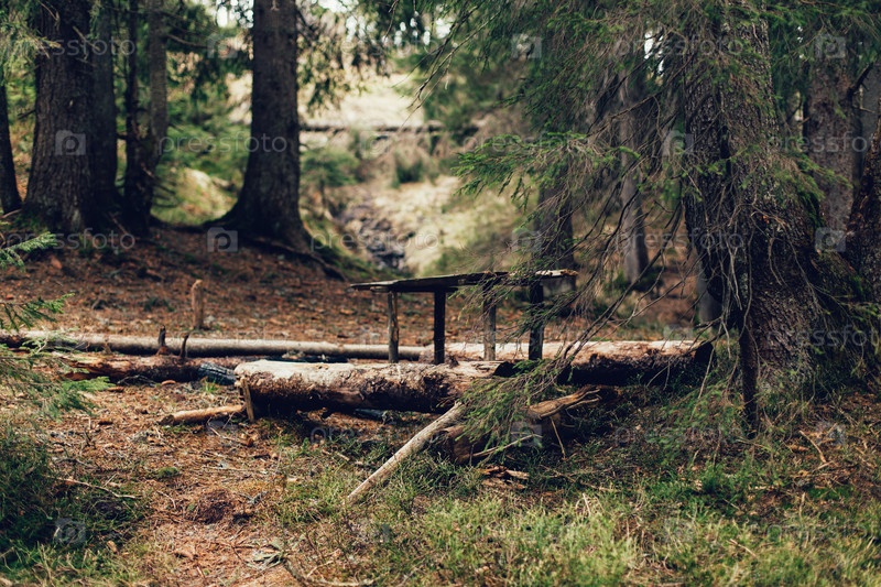 Деревянный столик для пикника и скамейка в лесу
