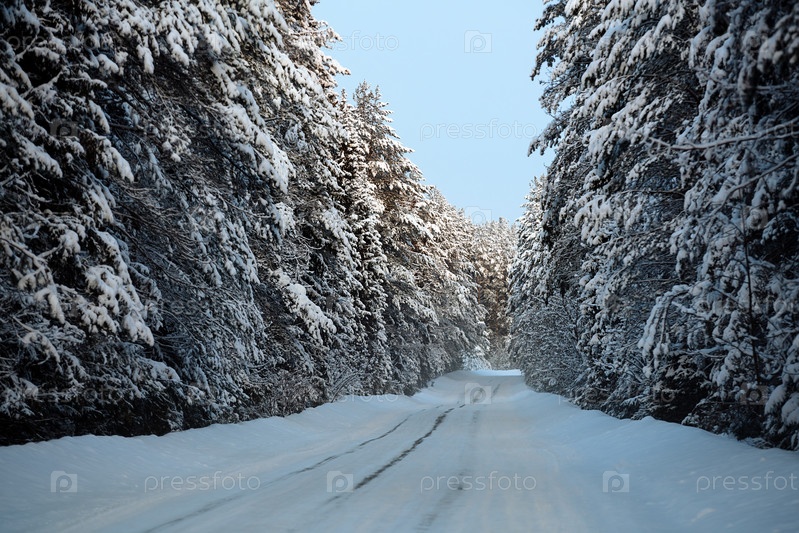 Фантастический вид на снежную дорогу в зимнем лесу