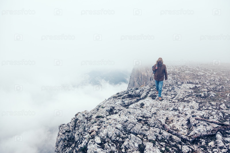 Мужчина в горах в тумане