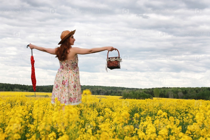 Девушка в поле цветов с зонтиком и шляпой