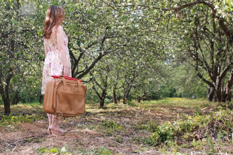 Женщина в саду с чемоданом
