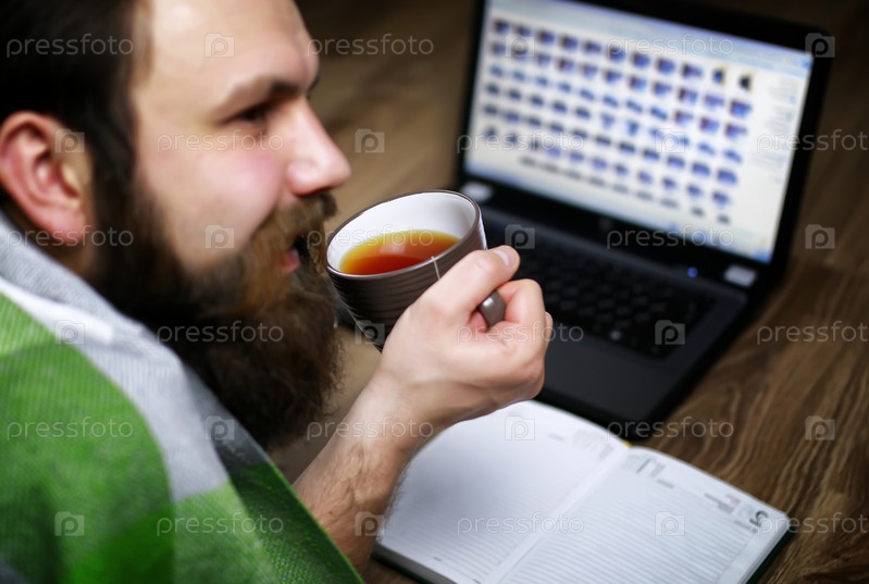 Бородатый красивый мужчина лежит на полу с ноутбуком