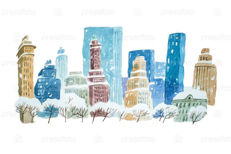 Акварельный городской зимний пейзаж