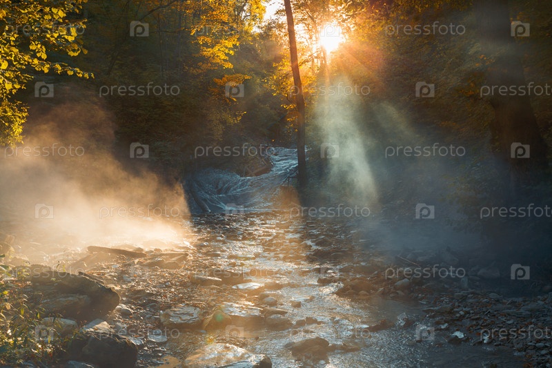 Солнечные лучи пробиваются сквозь утренний туман и листья деревьев