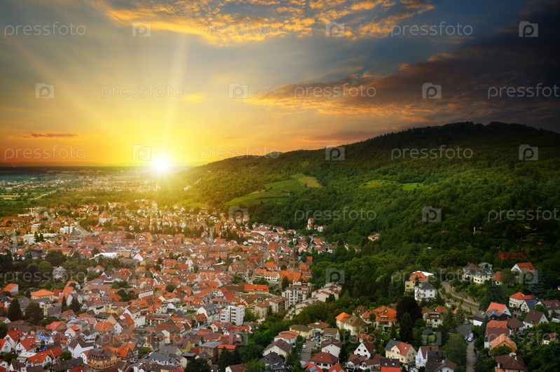 Город в горной долине и восход солнца