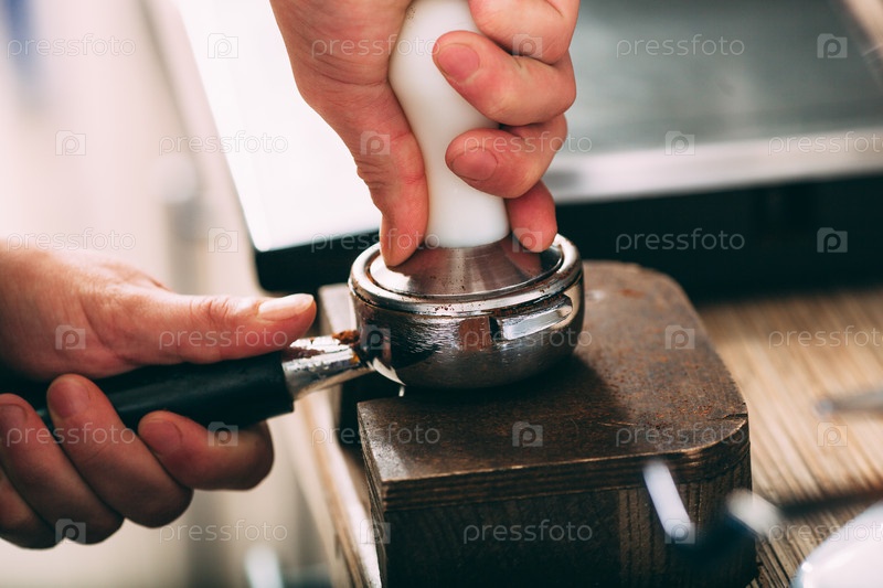 Бариста прижимает кофе в держателе