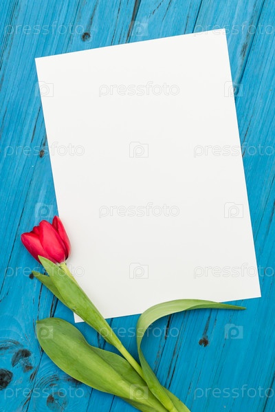 Красный тюльпан на голубой деревянной доске