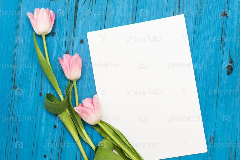 Розовые тюльпаны на синей деревянной доске