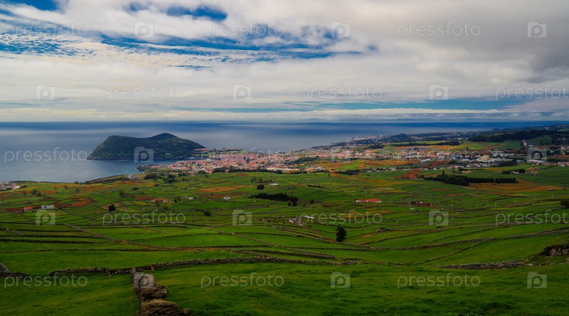 Пейзаж с вулканом Монте-Бразиль и Ангра-ду-Эроижму на острове Терсейра, Португалия