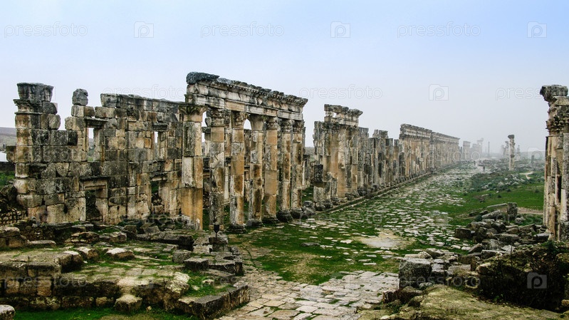 Великая колоннада Апамеа в тумане, частично разрушена ИСИС, Сирия