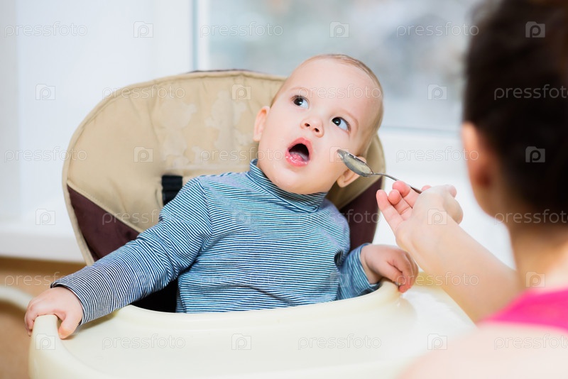 Мать кормит ребенка с ложки