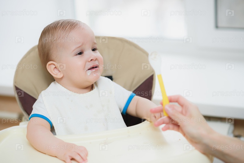 Мать кормит малыша с ложки