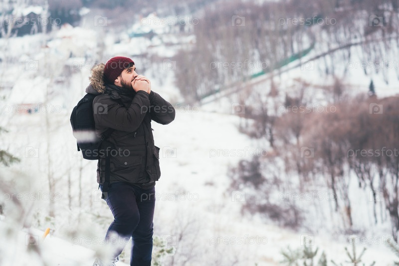 Путешественник согревает руки дыханием