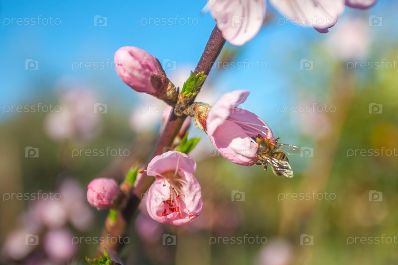 Пчела на цветках персика