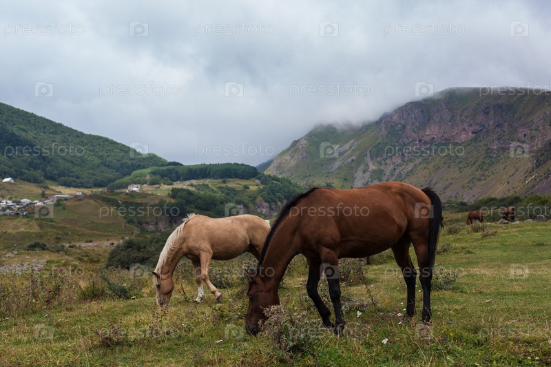 Горный пейзаж с пасущимися лошадьми