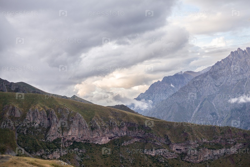 Красивый вечерний горный пейзаж под ярким закатом. Грузия, Казбеги