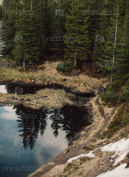 Горное озеро в еловом лесу