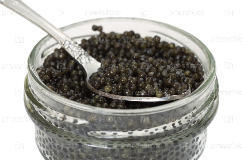 Черная икра в стеклянной банке с ложкой