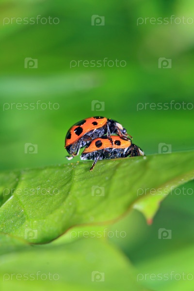 Две божьих коровки на зеленом листике