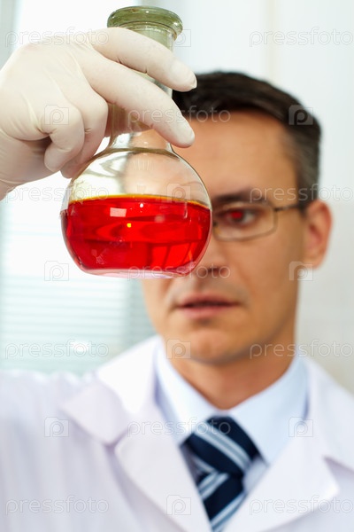 Химик с колбой в лаборатории