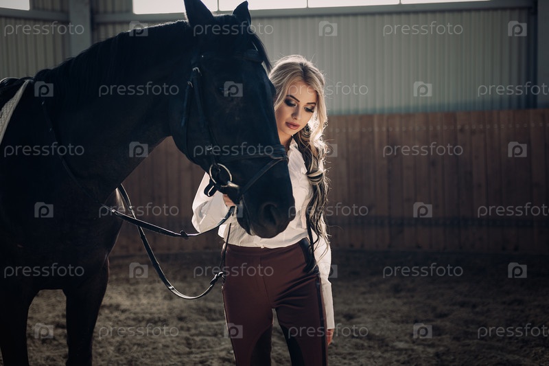 Красивая элегантная молодая блондинка рядом с лошадью
