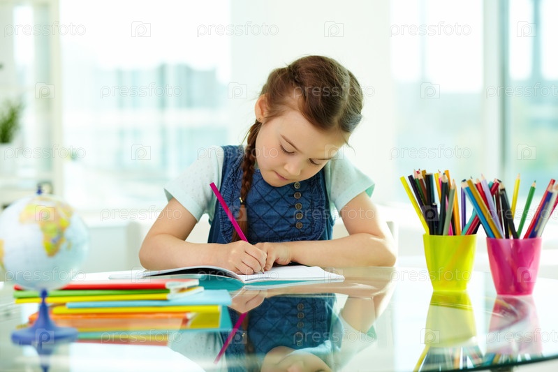 Маленькая девочка рисует, сидя за столом