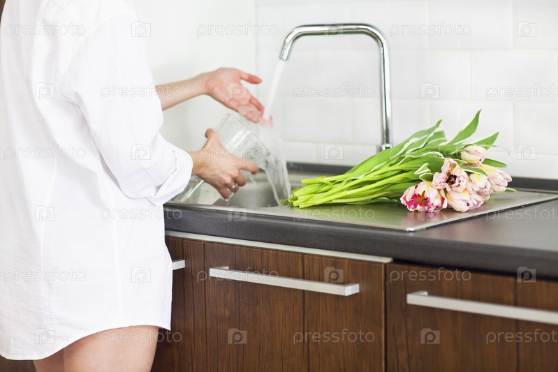 Молодая женщина наполняет вазу водой для цветов