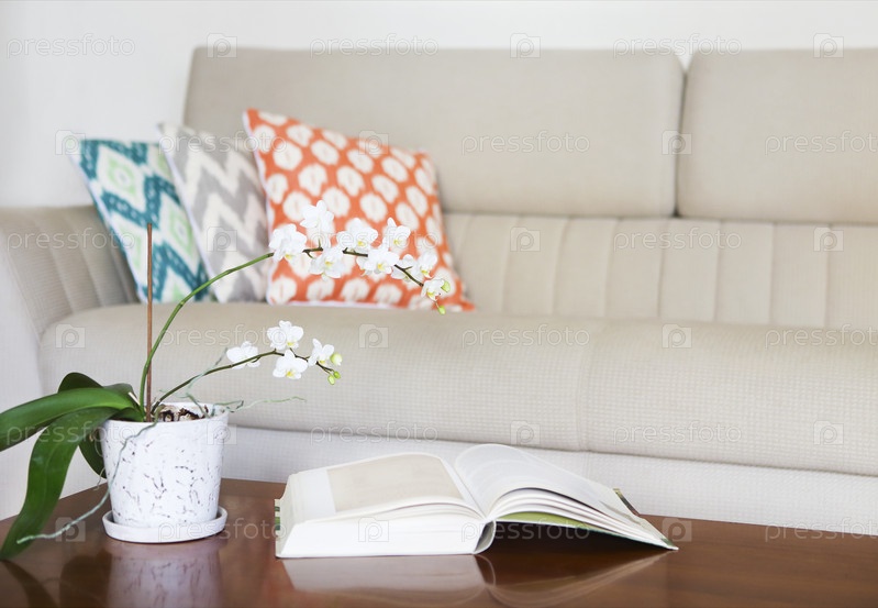Красивая белая орхидея и открытая книга на деревянном столе