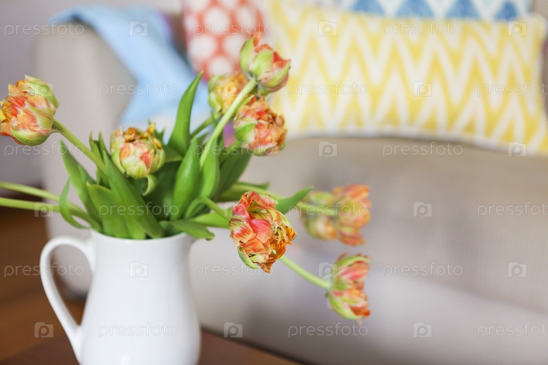 Красивый букет оранжевых тюльпанов на деревянном столе в гостиной