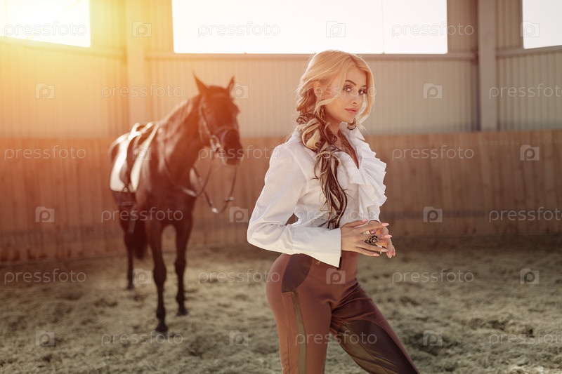 Красивая элегантная молодая блондинка с лошадью