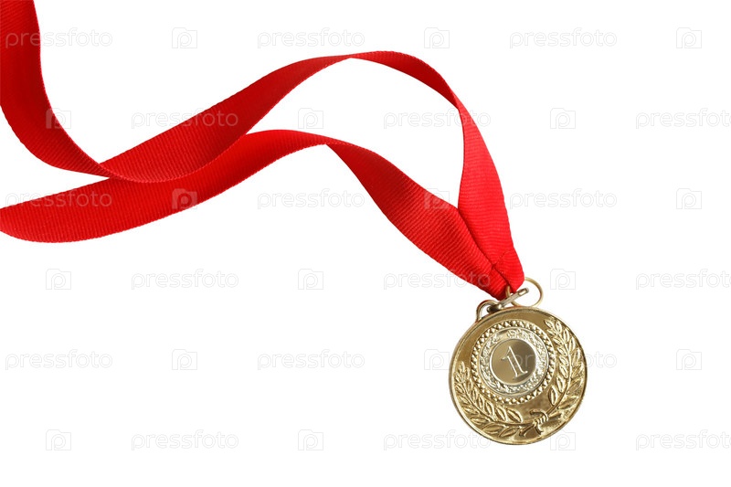 Золотая медаль с красной лентой, изолировано на белом