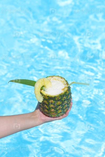 Рука с экзотическим коктейлем из ананаса рядом с бассейном