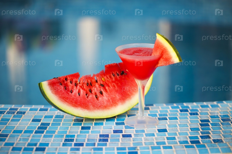 Стакан арбузного коктейля с кусочком арбуза возле бассейна