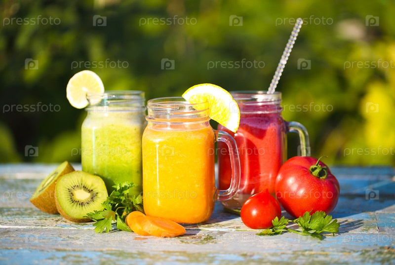Три бокала овощного и фруктового сока