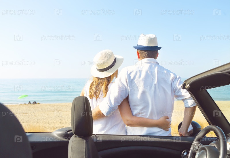 Счастливая пара в автомобиле на пляже