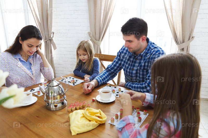 Счастливая молодая семья, играющая в настольную игру