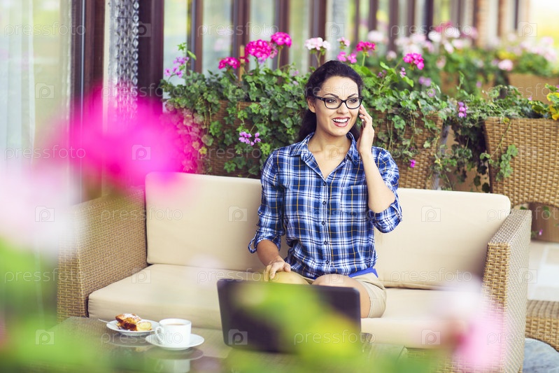 Молодая женщина, работающая на компьютере на открытом воздухе