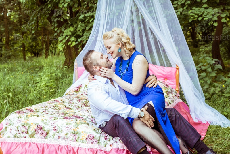 Романтичная пара в постели на лугу