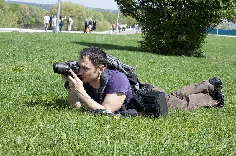 Фотограф с цифровой камерой на зеленой траве