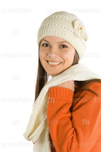 Красивая девушка в шапке и шарфе изолирована на белом фоне