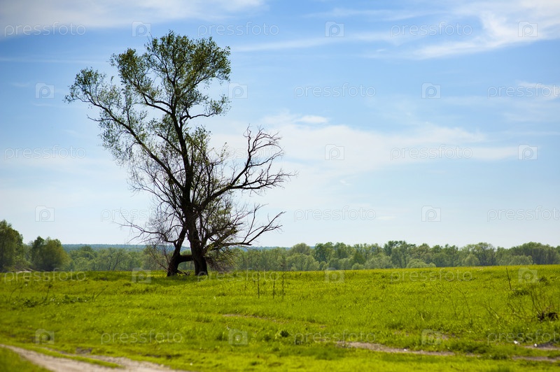 Дерево в поле под голубым небом с облаками