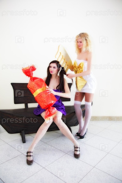 Кукла причесывает другую куклу, чтобы получить конфету