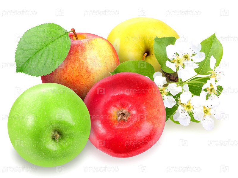 Свежие яблоки с зелеными листьями и белыми цветами на белом фоне крупным планом