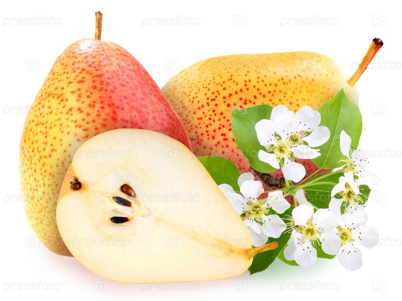 Свежие груши с зелеными листьями и белыми цветами на белом фоне крупным планом